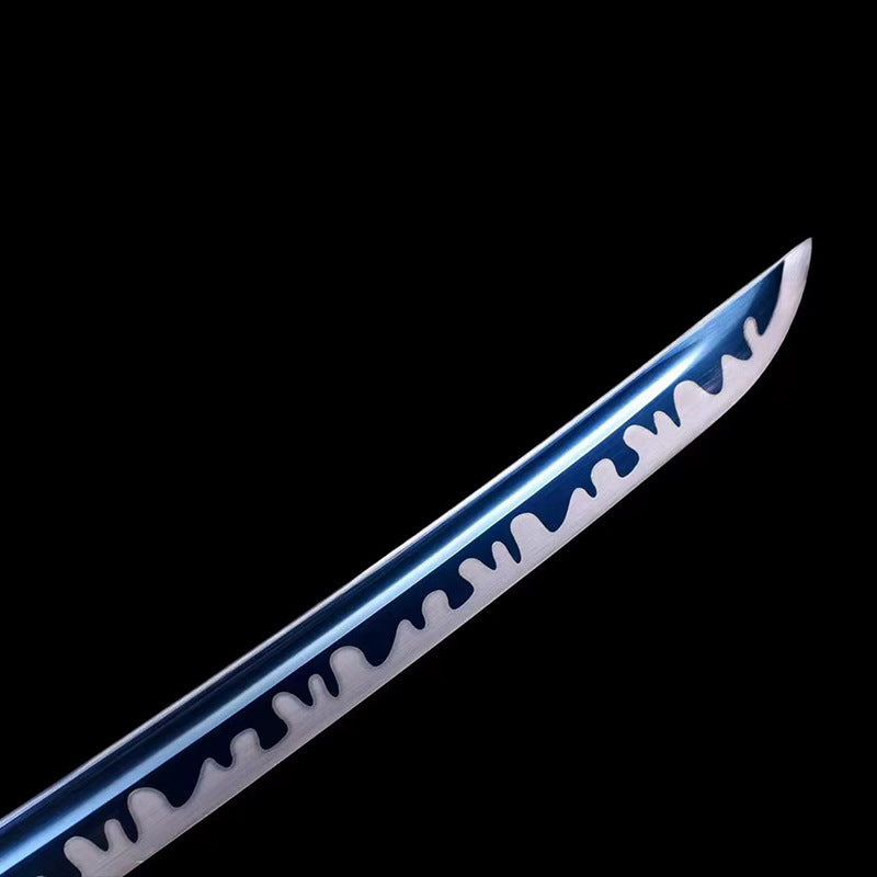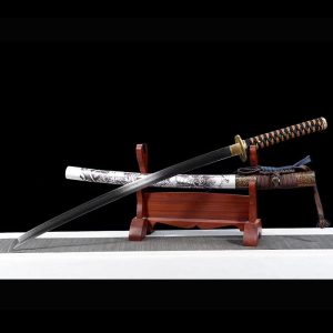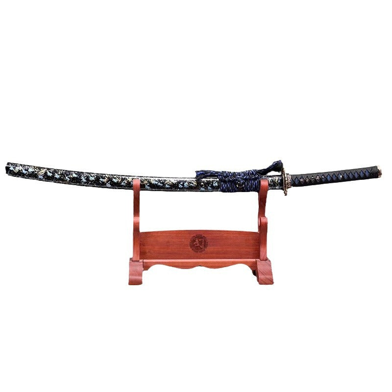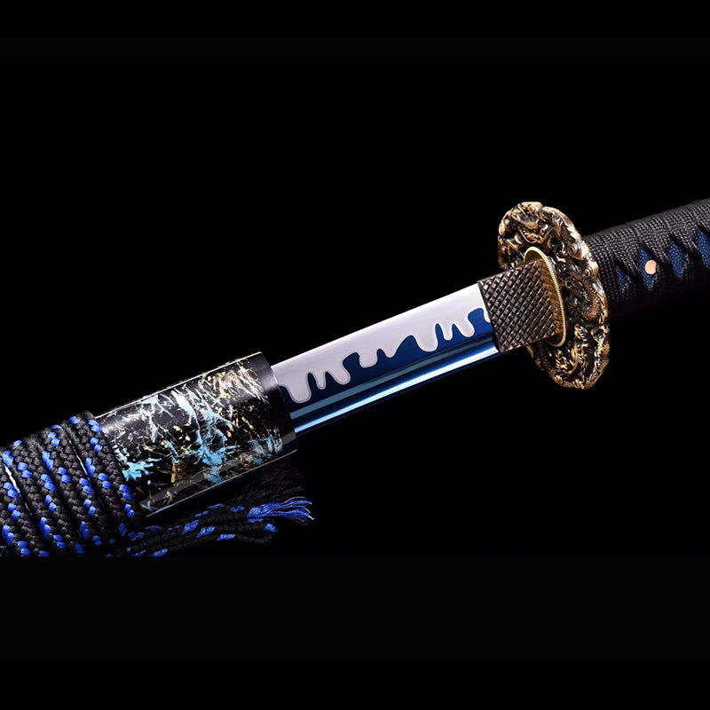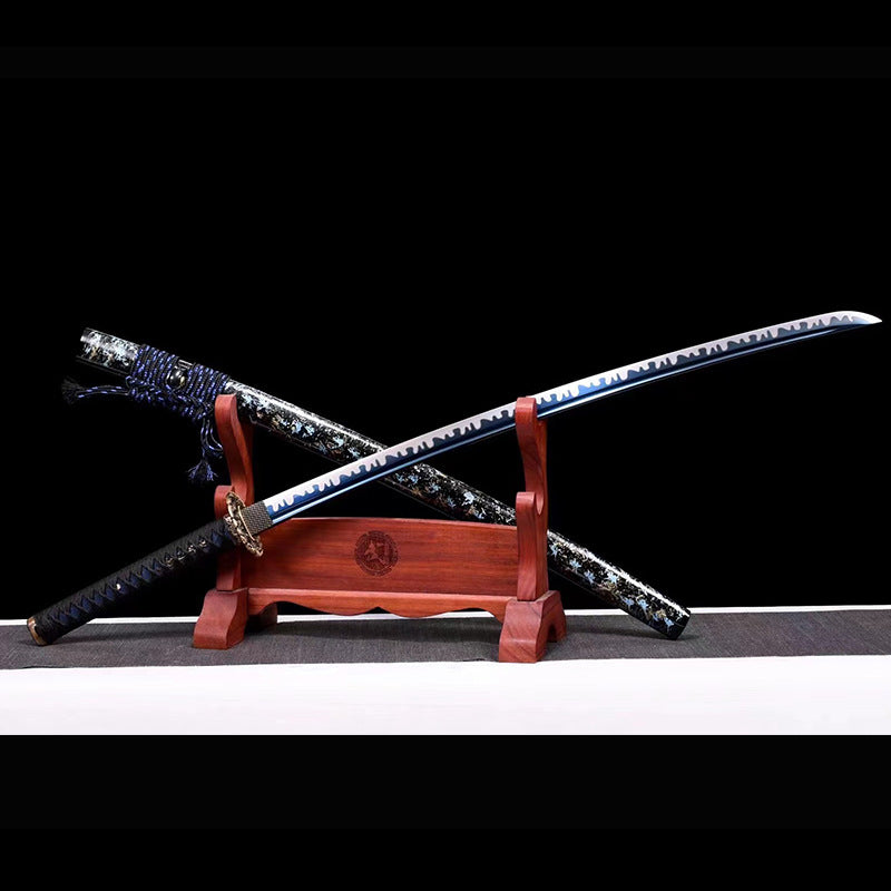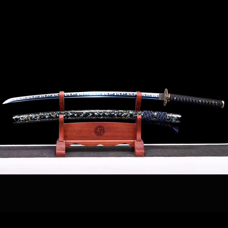 The blade is treated with blueing process. the edge is fully hand-made double-line grinding and whitening to achieve high hardness. pure copper carved set hilt. solid wood scabbard and lacquer scabbard.